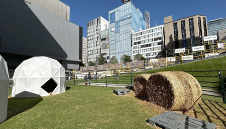 札幌市中心部にあるビル跡地を、「農とアート」をテーマにした空間として活用するプロジェクトが行われている。都心に牧草ロールなどが置かれ、観光客や周辺で働く会社員らの憩いの場になっている=9日 【時事通信社】